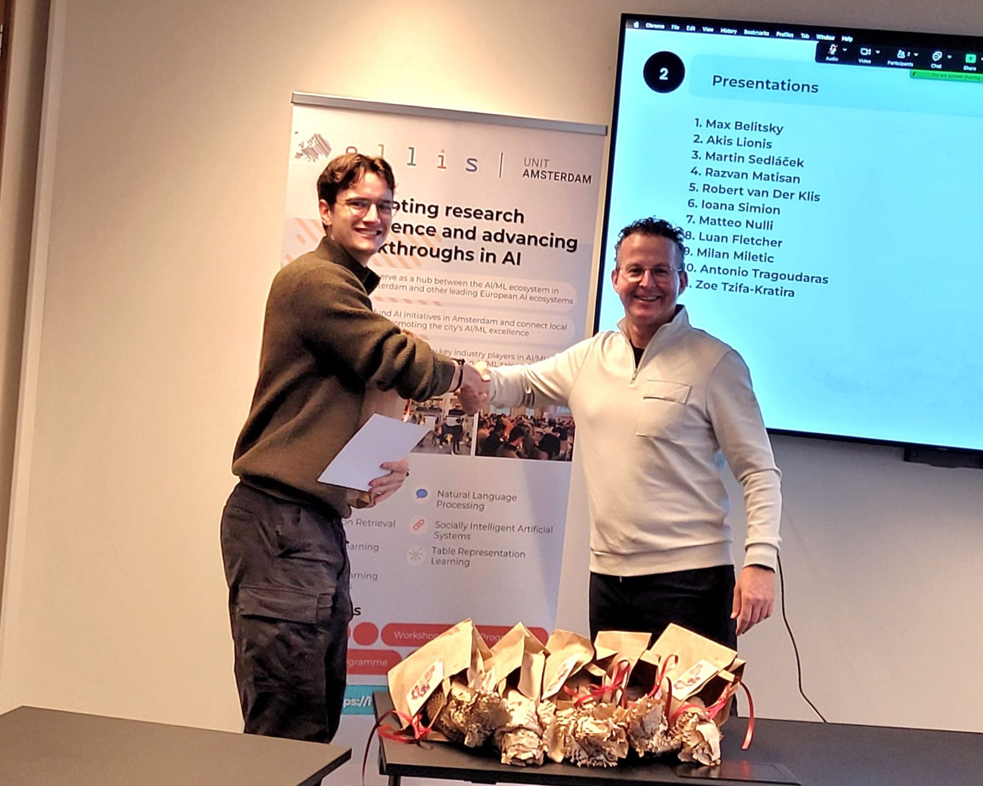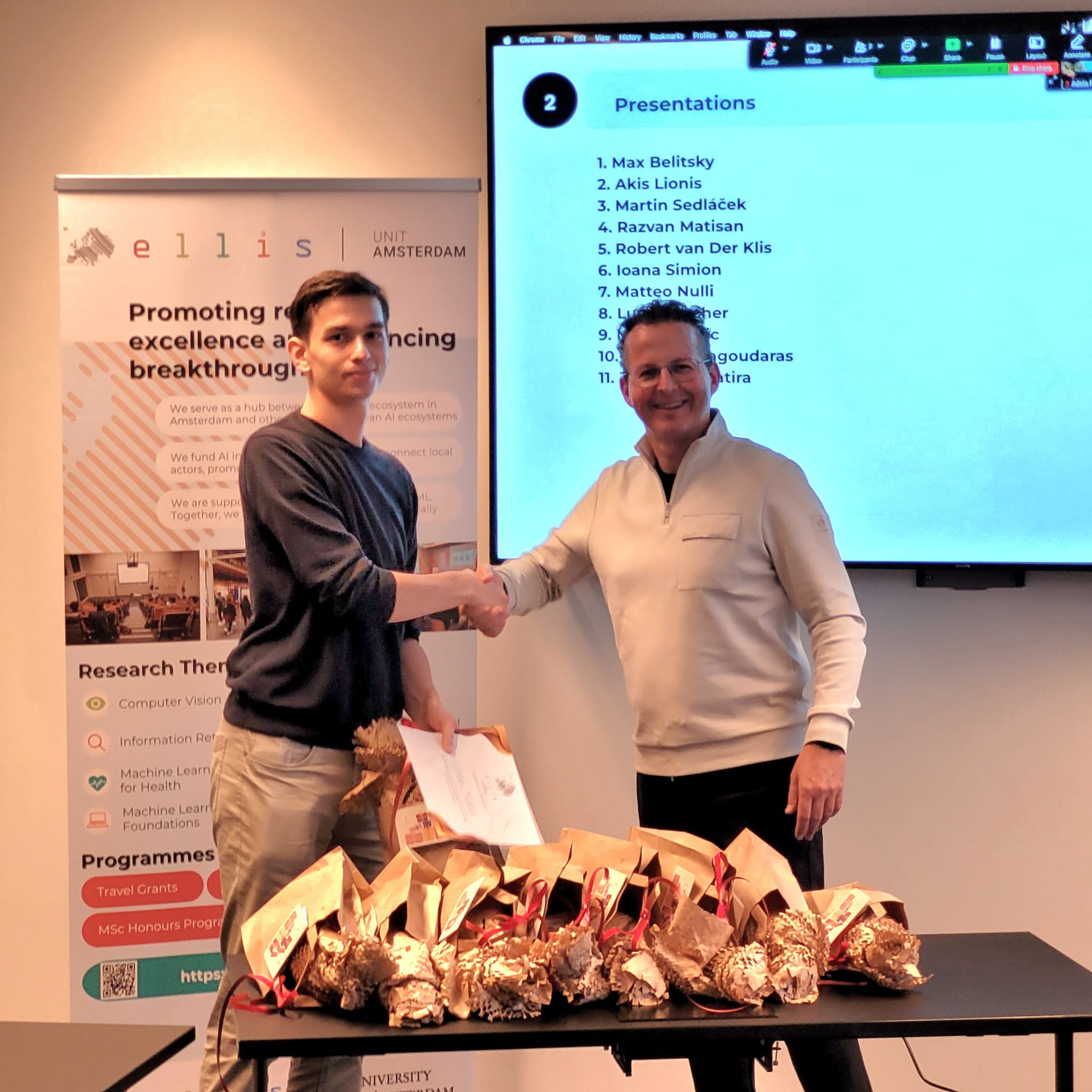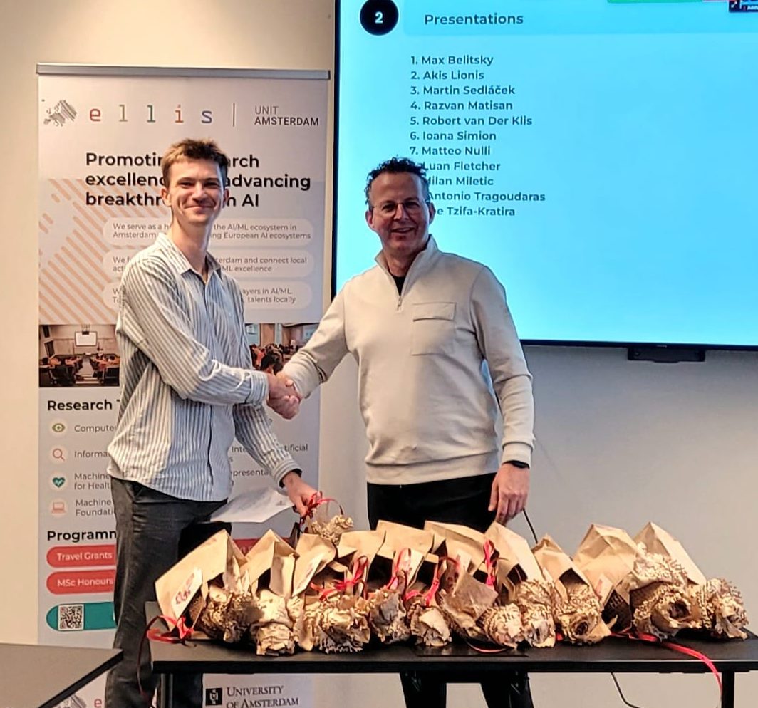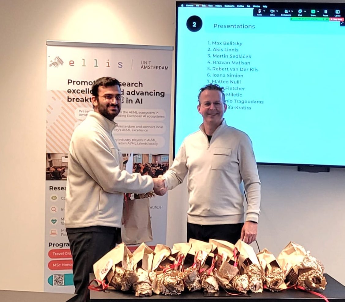On 28 October 2025, we shone a spotlight on the 11 graduating MSc Honours students of the ELLIS unit in Amsterdam who shared their thesis research results and the experiences they gained from the programme. Prof. Dr. Cees Snoek, on behalf of the Director of the unit, who was on parental leave, awarded the students their MSc Honours certificates upon the completion of their degree cum laude, along with special graduation gifts. Once again, we congratulated the students for their hard work and remarkable achievements!