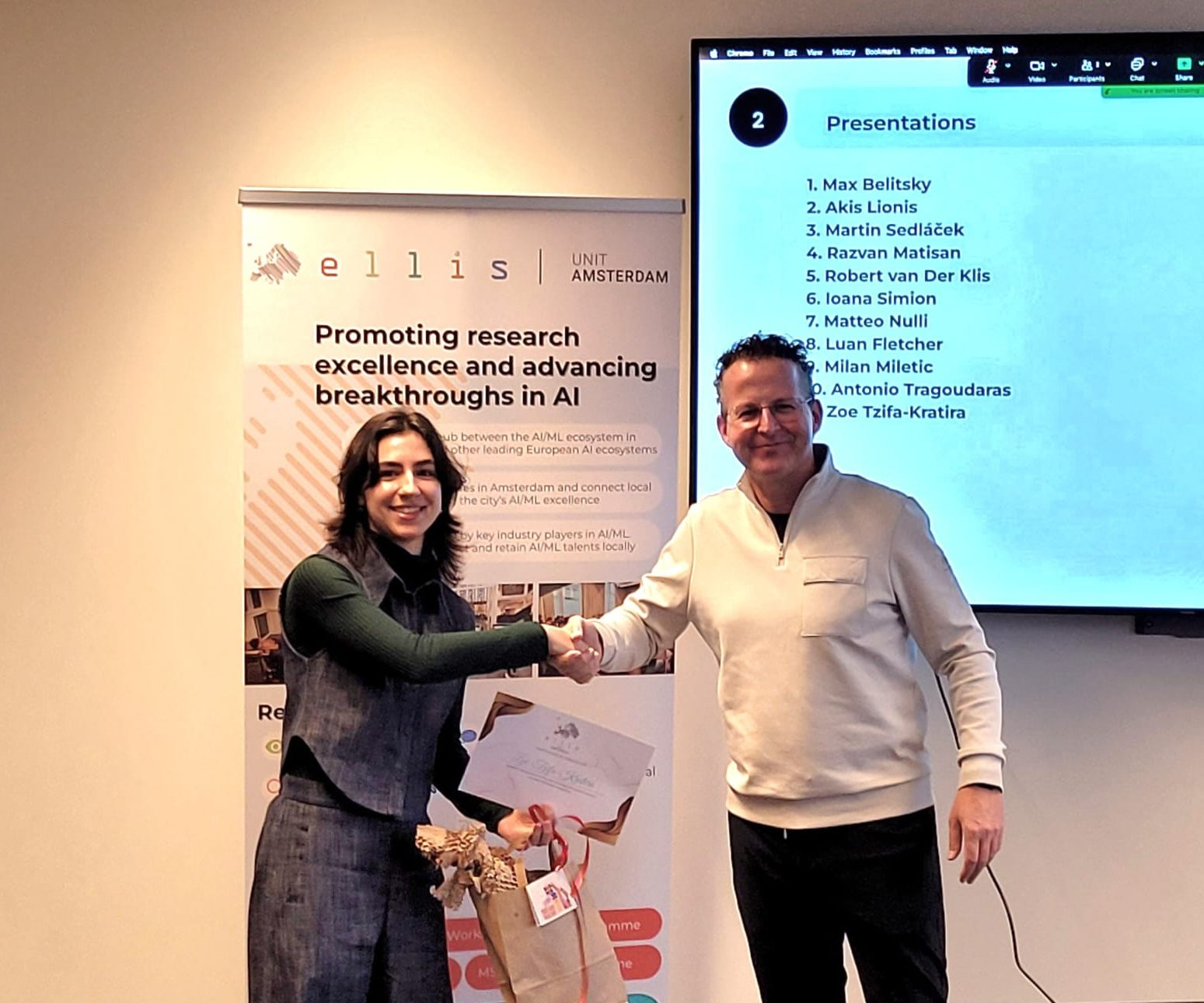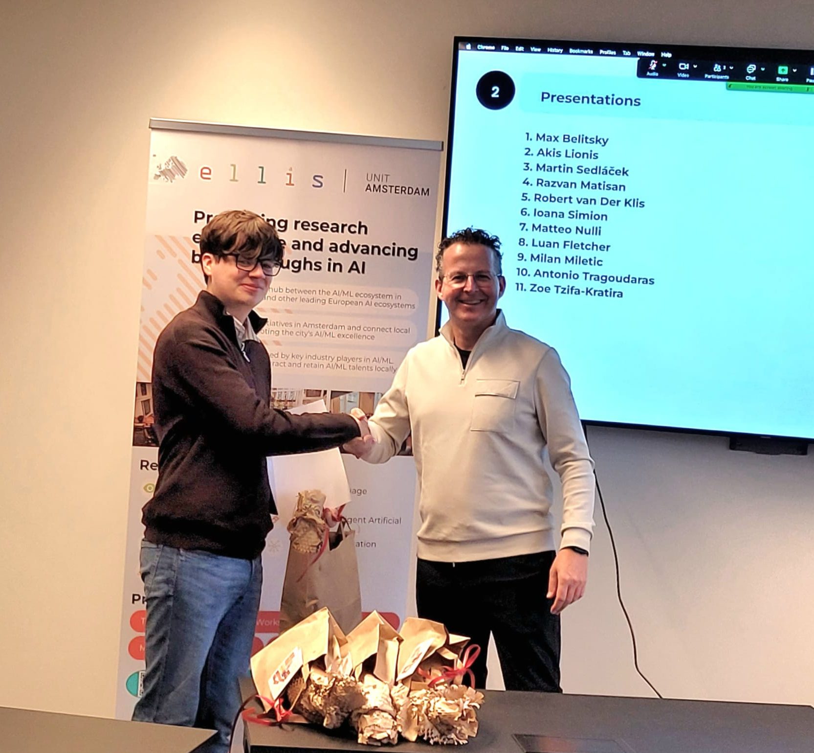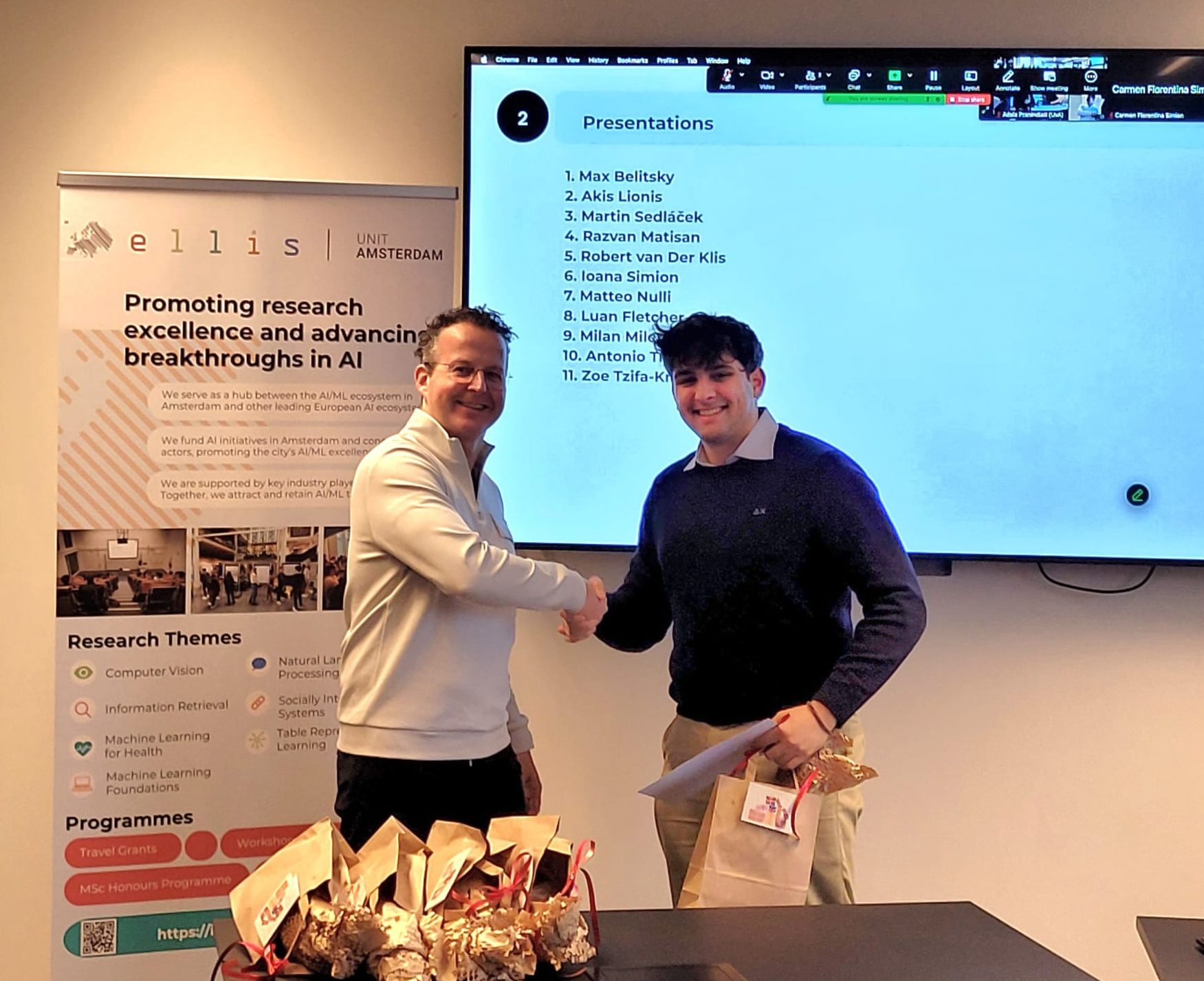 On 28 October 2025, we shone a spotlight on the 11 graduating MSc Honours students of the ELLIS unit in Amsterdam who shared their thesis research results and the experiences they gained from the programme. Prof. Dr. Cees Snoek, on behalf of the Director of the unit, who was on parental leave, awarded the students their MSc Honours certificates upon the completion of their degree cum laude, along with special graduation gifts. Once again, we congratulated the students for their hard work and remarkable achievements!