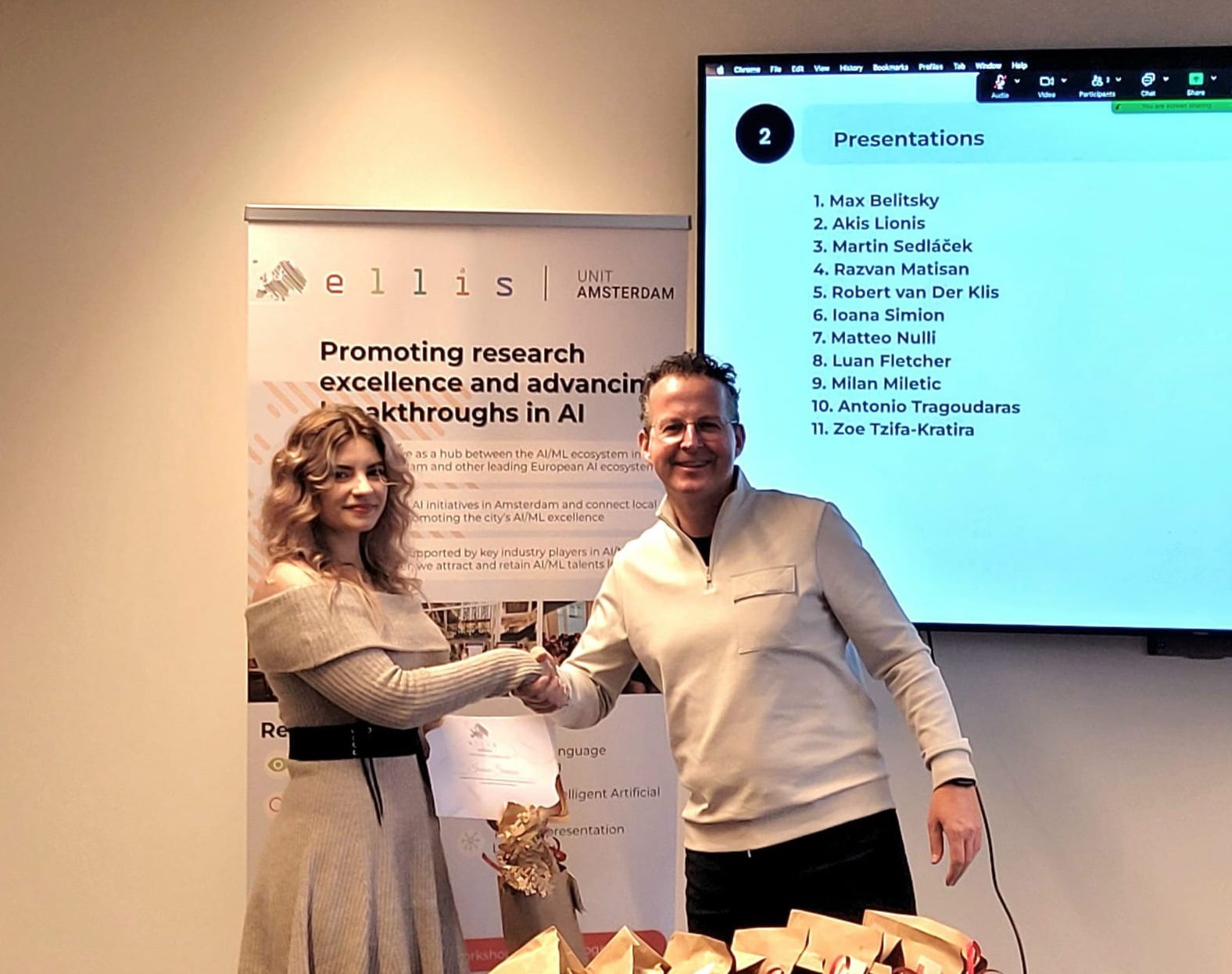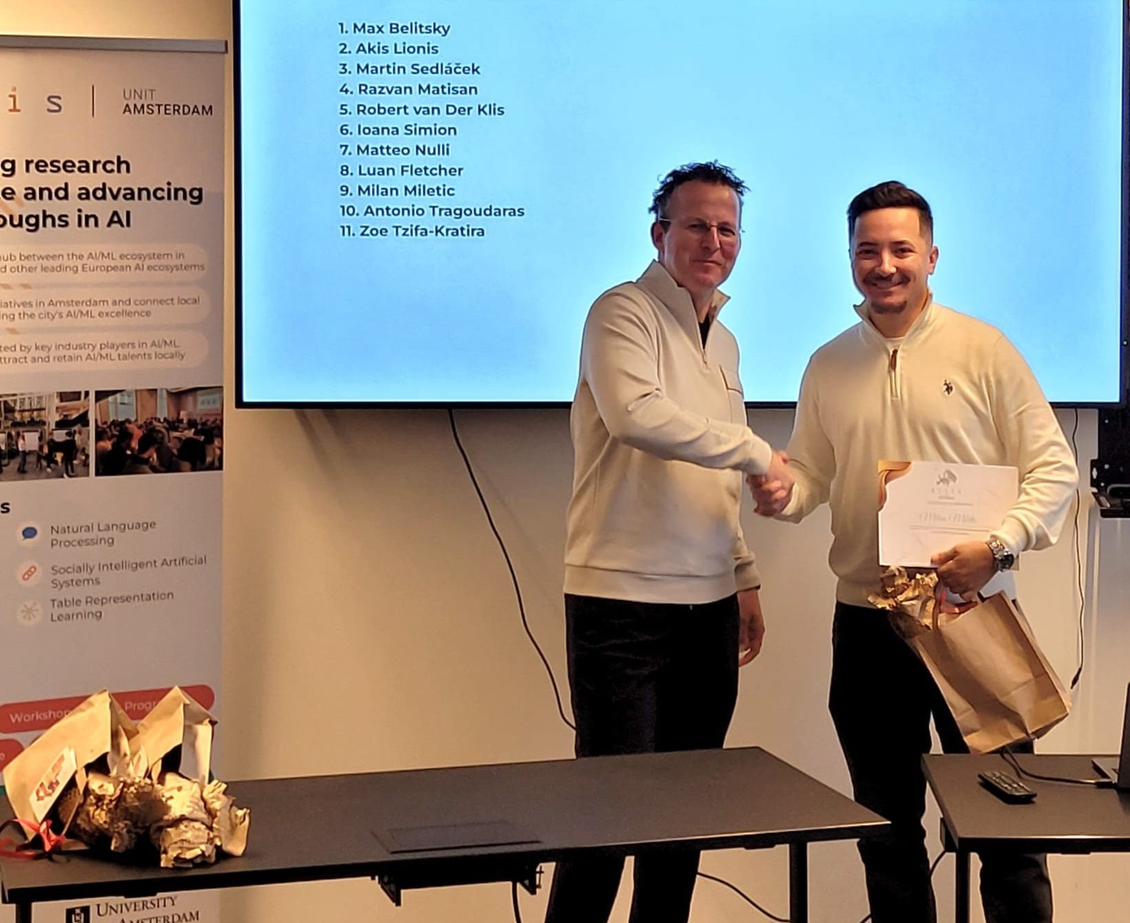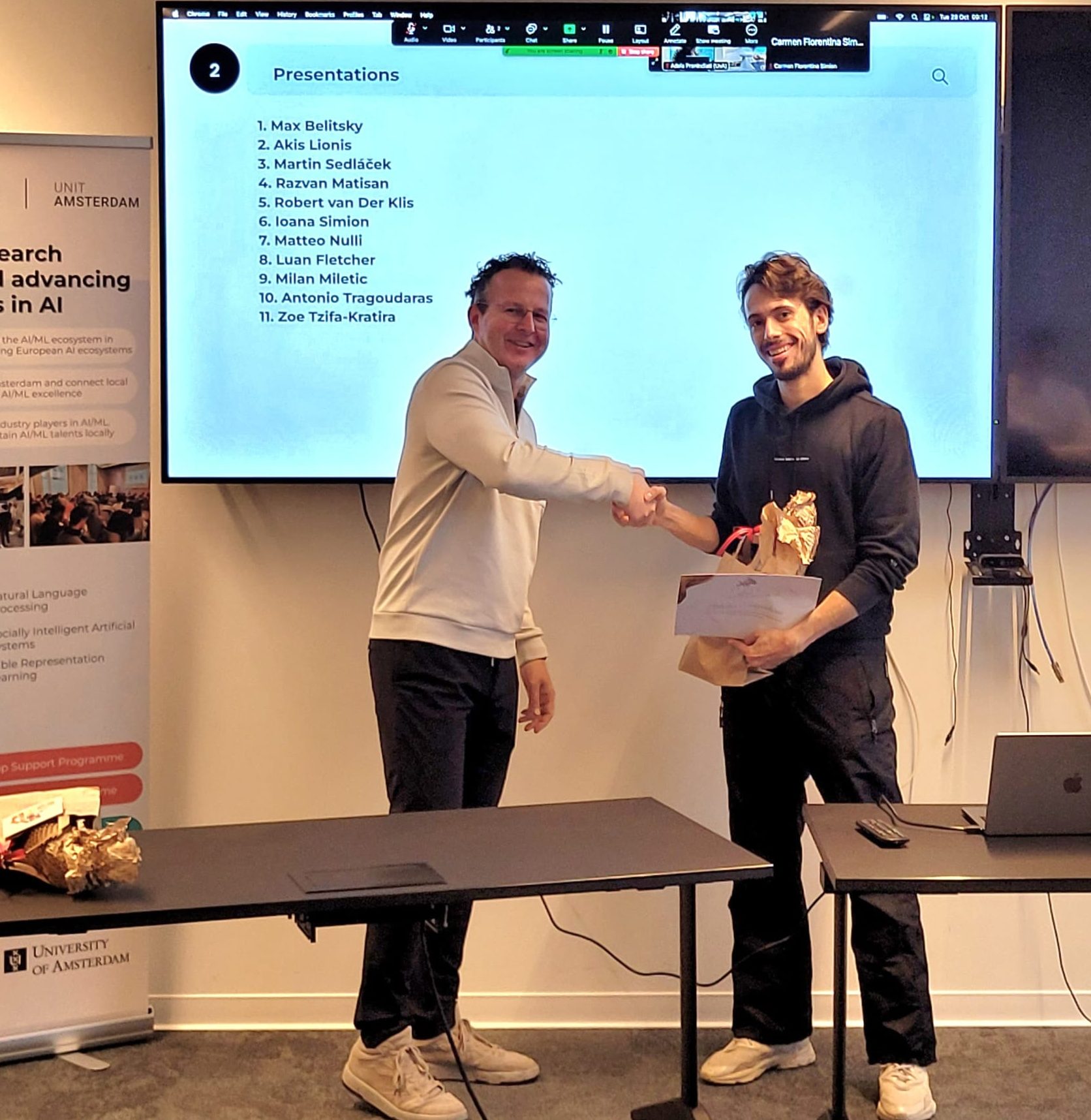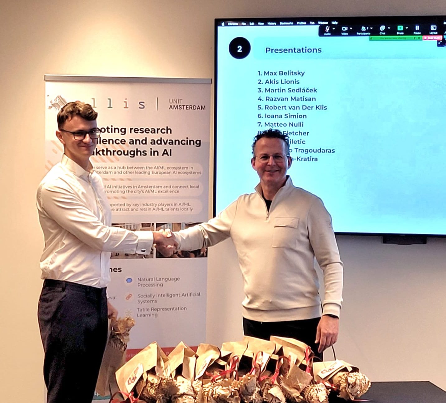 On 28 October 2025, we shone a spotlight on the 11 graduating MSc Honours students of the ELLIS unit in Amsterdam who shared their thesis research results and the experiences they gained from the programme. Prof. Dr. Cees Snoek, on behalf of the Director of the unit, who was on parental leave, awarded the students their MSc Honours certificates upon the completion of their degree cum laude, along with special graduation gifts. Once again, we congratulated the students for their hard work and remarkable achievements!