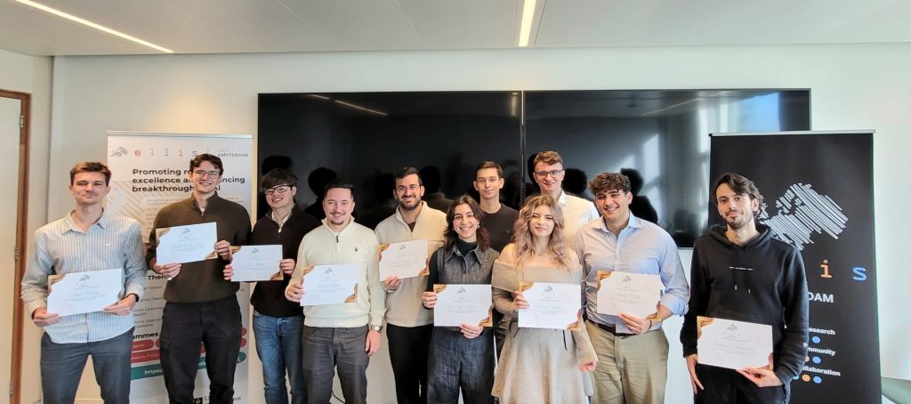 On 28 October 2025, we shone a spotlight on the 11 graduating MSc Honours students of the ELLIS unit in Amsterdam who shared their thesis research results and the experiences they gained from the programme. Prof. Dr. Cees Snoek, on behalf of the Director of the unit, who was on parental leave, awarded the students their MSc Honours certificates upon the completion of their degree cum laude, along with special graduation gifts. Once again, we congratulated the students for their hard work and remarkable achievements!