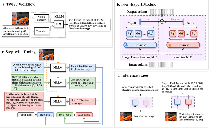 Spatial awareness is key to enable embodied multimodal AI systems. Yet, without vast amounts of spatial supervision, current Multimodal Large Language Models (MLLMs) struggle at this task. In this paper, we introduce TWIST & SCOUT, a framework that equips pre-trained MLLMs with visual grounding ability without forgetting their existing image and language understanding skills. To this end, we propose TWIST, a twin-expert stepwise tuning module that modifies the decoder of the language model using one frozen module pre-trained on image understanding tasks and another learnable one for visual grounding tasks. This allows the MLLM to retain previously learned knowledge and skills, while acquiring what is missing. To fine-tune the model effectively, we generate a high-quality synthetic dataset we call SCOUT, which mimics human reasoning in visual grounding. This dataset provides rich supervision signals, describing a step-by-step multimodal reasoning process, thereby simplifying the task of visual grounding. We evaluate our approach on several standard benchmark datasets, encompassing grounded image captioning, zero-shot localization, and visual grounding tasks. Our method consistently delivers strong performance across all tasks, while retaining the pre-trained image understanding capabilities.