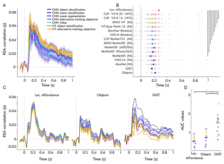 The human visual system processes scenes with remarkable speed, enabling the extraction of essential information to navigate our surroundings in a single glance. To elucidate how the brain transforms visual inputs into neural representations of navigationally relevant information, we collected electroencephalography (EEG) responses to diverse indoor and outdoor scenes along with behavioral annotations of locomotive action affordances (e.g., walking, cycling), object annotations, and low-level image features to model distinct types of scene information. Using representational similarity analysis, we examined the neural representation of locomotive action affordances over time, their co-localization within scene-selective cortex, and their computational alignment with deep neural networks (DNNs). Our results show that locomotive action affordance representations emerge within 200 ms of visual processing, showing unique contributions to EEG responses at temporally distinct time-points from objects and low-level properties. Spatiotemporal fusion with functional magnetic resonance imaging (fMRI) recordings in scene-selective brain regions reveals that both the parahippocampal and occipital place region (but not the medial place region) contribute to locomotive action affordance representations, with a distinct temporal hierarchy between them. While DNNs align well with early EEG responses, they primarily capture low-level features and show limited alignment with affordance processing. These findings reveal a temporally distinct neural representation of action affordances and highlight a limitation of current DNNs in modeling affordance perception.