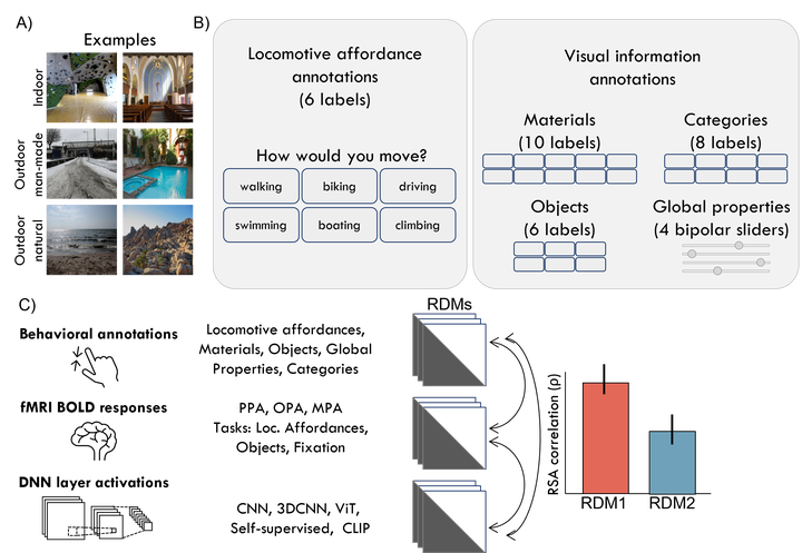 To decide how to move around the world, we must determine which locomotive actions (e.g., walking, swimming, or climbing) are afforded by the immediate visual environment. The neural basis of our ability to recognize locomotive affordances is unknown. Here, we compare human behavioral annotations, functional magnetic resonance imaging (fMRI) measurements, and deep neural network (DNN) activations to both indoor and outdoor real-world images to demonstrate that human visual cortex represents locomotive action affordances in complex visual scenes. Hierarchical clustering of behavioral annotations of six possible locomotive actions show that humans group environments into distinct affordance clusters using at least three separate dimensions. Representational similarity analysis of multi-voxel fMRI responses in scene-selective visual cortex shows that perceived locomotive affordances are represented independently from other scene properties such as objects, surface materials, scene category or global properties, and independent of the task performed in the scanner. Visual feature activations from DNNs trained on object or scene classification as well as a range of other visual understanding tasks correlate comparatively lower with behavioral and neural representations of locomotive affordances than with object representations. Training DNNs directly on affordance labels or using affordance-centered language embeddings increases alignment with human behavior, but none of the tested models fully captures locomotive action affordance perception. These results uncover a new type of representation in the human brain that reflects locomotive action affordances.