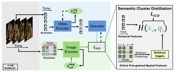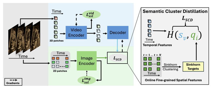 Self-supervised learning (SSL) has achieved major advances in natural images and video understanding, but challenges remain in domains like echocardiography (heart ultrasound) due to subtle anatomical structures, complex temporal dynamics, and the current lack of domain-specific pre-trained models. Existing SSL approaches such as contrastive, masked modeling, and clustering-based methods struggle with high intersample similarity, sensitivity to low PSNR inputs common in ultrasound, or aggressive augmentations that distort clinically relevant features. We present DISCOVR (Distilled Image Supervision for Cross Modal Video Representation), a self-supervised dual branch framework for cardiac ultrasound video representation learning. DISCOVR combines a clustering-based video encoder that models temporal dynamics with an online image encoder that extracts fine-grained spatial semantics. These branches are connected through a semantic cluster distillation loss that transfers anatomical knowledge from the evolving image encoder to the video encoder, enabling temporally coherent representations enriched with fine-grained semantic understanding. Evaluated on six echocardiography datasets spanning fetal, pediatric, and adult populations, DISCOVR outperforms both specialized video anomaly detection methods and state-of-the-art video-SSL baselines in zero-shot and linear probing setups, and achieves superior segmentation transfer.